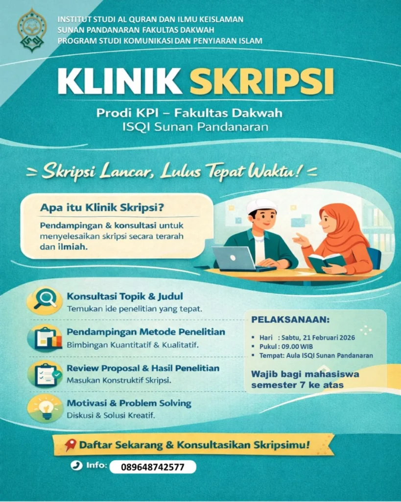 Sleman – Dalam upaya meningkatkan kualitas karya ilmiah mahasiswa sekaligus mendorong kelulusan tepat waktu, Program Studi Komunikasi dan Penyiaran Islam (KPI) Fakultas Dakwah ISQI Sunan Pandanaran menghadirkan program Klinik Skripsi sebagai wadah pendampingan akademik bagi mahasiswa tingkat akhir.